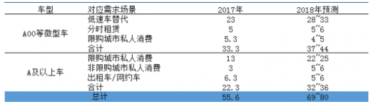 综上所述,纯电动市场上的主力,a00 车型的大部分需求来自低速车替代场景,而目前补贴规则正在调整种不健康的发展,预计2018年下半年对应低速车代替的市场需求会受到较大影响,全年a00 车型的销量或在37 万~44 万辆。