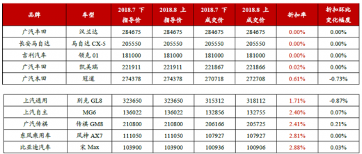 以上市超 6 个月且最近 3 个月零售销量均值超过 3000 辆的车型来做样本,对此进行排序。其中上汽通用英朗,长安福特福睿斯,上汽通用迈锐宝,上期通用威朗,华晨宝马 1 系,上汽大众昕锐,上汽大众桑塔纳,一汽大众奥迪 q3,长安福特福睿斯和上汽大众明锐是2018年8 月上半月折扣率绝对值排名前十的车型。而广汽丰田汉兰达,长安马自达 cx-5,吉利领克 01 和广汽丰田凯美瑞以无折扣并列第一,之后有广汽本田冠道、上汽通用 gl8、广汽传祺 gm8、东风风神 ax7 和比亚迪宋 max是2018年8 月上半月折扣率绝对值排名后十的车型。
