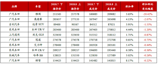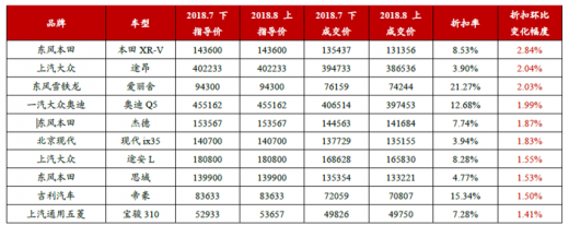 东风本田 xr-v,上汽大众途昂,东风雪铁龙爱丽舍,一汽大众奥迪 q5,东风本田杰德,北京现代 ix35,上汽大众途安 l,东风本田思域,吉利帝豪和上汽通用五菱宝骏 310是2018年8 月上半月折扣率增幅前十的车型。