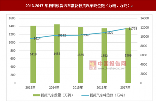 据统计,2017年,我国拥有载货汽车1369万辆,比上年增长1.2%,载货汽车吨位数为11775万吨位,比上年增长8.8%。