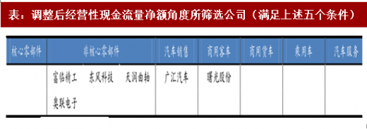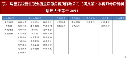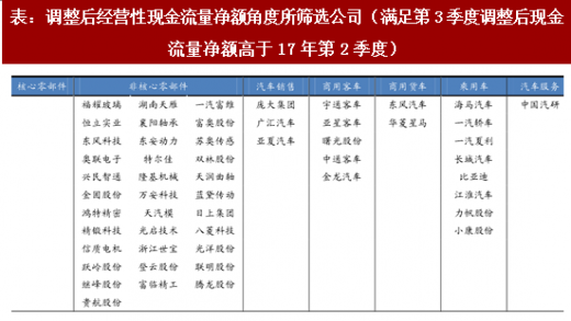 我们利用调整后经营性现金流量净额对公司进行筛选,在统计的104家上市公司中,17年第3季度归母净利润同比增速大于等于30%的公司共38家;17年第3季度调整后经营性现金净流量高于归母净利润的公司共有57家;第3季度调整后经营性现金净流量增速高于归母净利润增速的公司共有49家;第3季度调整后现金流量净额高于17年第2季度的公司共有53家;第3季度营业收入含金量(调整后现金流量净额/营业收入)高于17年第2季度的公司共有56家;同时符合上述五个条件的公司共有6家。我们认为,在汽车行业销量回归平稳增长的大背景下,营运能力较高的公司可能有不错的业绩表现,而调整后的经营性现金流量净额可以作为衡量公司营运能力的指标之一。