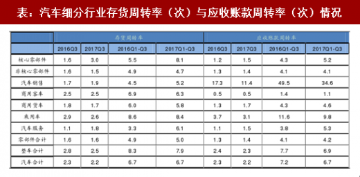 2017年前3季度汽车行业存货周转率较去年同期持平,应收账款周转率较去年同期下降0.5次。其中,17年第3季度汽车行业存货周转率、应收账款周转率均同比下降0.1次。