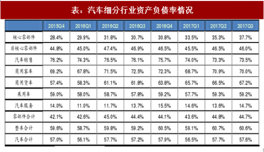 从细分行业来看,17年前3季度核心零部件、商用货车、乘用车、汽车服务板块资产负债率有所提升,分别同比上升7.0、5.4、1.4、1.0个百分点,汽车销售、商用客车、非核心零部件板块资产负债率同比下降2.6、2.5、0.9个百分点。