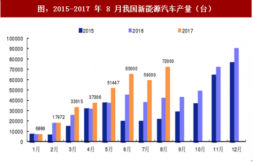 环境保护因素,新能源汽车快速渗透成为必然趋势:2040 年法国、英国禁止燃油汽车的销售,大众汽车投资 840 亿美元生产电动车与电池。我国新能源汽车市场也迎来高速增长,中汽协最新数据显示,8 月份新能源汽车产量为 7.2 万辆,环比增加 22%,2017 年上半年,新能源汽车产量和销量分别为 21.2 万辆和 19.5 万辆,同比增长 19.7%和 14.4%。其中,纯电动汽车产量和销量分别为 17.5 万辆和 16 万辆,同比增长 30.4%和 26.2%。如果新能源汽车相关政策没有较大的调整,预计全年销量在 60~70 万辆。
