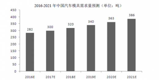 汽车产业未来朝轻量化车身设计和安全性、电动汽车与氢动力汽车的新能源汽车,以及智能汽车等产业发展趋势,将促进汽车模具的开发。前瞻产业研究院预测,到2021 年,中国汽车产量将达到近3575 万辆,年均增速在6.5%左右,而对于汽车模具的需求将达到386 吨。