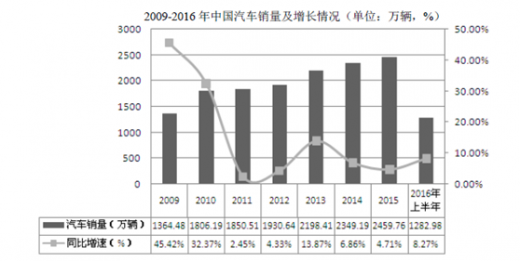 我国在2009 年推汽车下乡政策,提出总值4 兆元人民币的补助措施,使得我国汽车销量一举超过美国,成为全球第一大汽车市场。2009-2015 年我国汽车销量呈现快速增长趋势,2009 年汽车的销量增长率为近年来最高,达到45.42%,到2013 年汽车销量为2,198.41 万辆,同比增长13.87%,2014 年销量增加至2,349.19 万辆,同比增长6.86%。2015 年汽车销量为2,459.76 万辆,同比增长4.71%。2016 年上半年我国汽车销量为1,282.98 万辆,较上年同期增长了8.27个百分点。我国汽车销量增速虽有所放缓,但依然保持连年增长的势头。中国汽车工业协会预估2016 年我国汽车销量2,628 万台,年增长6.8%。2025 年汽车销量将达到3,000 万辆。