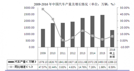 2009-2015 年我国汽车产量保持快速增长势头,从2009 年的1,379.10 万辆增加到2015 年2,450.33 万辆,年均增幅达到15.64%。2016 上半年,我国汽车产量为1,289.22 万辆,较上年同期增长6.59%。