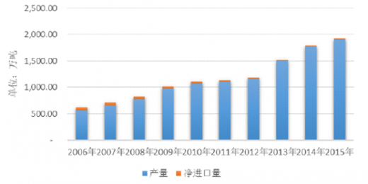 2006-2015年我国铜材年产量及消费量(单位:万吨)