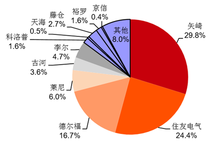 全球线束市场中,日本的矢崎和住友电气、藤仓和古河占据了超过60%的市场份额,韩国京信、裕罗、悠进也拥有将近15%的份额,其余市场份额被欧美的莱尼、德尔福、李尔、比克希、阿本斯贝格、科洛普所瓜分。