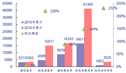 我们认为,新能源乘用车全年的产量将保持70%以上的高增速:在供应端,为了达到2020年百公里5升的油耗目标,各大乘用车企业大力发展新能源汽车,2016年总的销售目标超过35万辆;在销售端,一线城市消费者购买新能源汽车能够免去遥遥无期的摇号等待和购买牌照的高额费用、二三线城市和县乡地区的消费者对性价比极高的微型电动乘用车也有着强烈的需求。