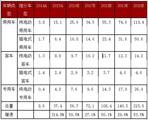 在明年补贴退坡20%的强力刺激下,我们认为下半年新能源汽车将迎来大爆发,全年新能源汽车总产量将达到56.7万辆,同比增长超过50%,虽然比2015年有所回落,但仍然是非常高的增速。在我们的预测中,乘用车和专用车的产量增速分别为70%和50%,相对比较保守。如新政策落地的进度超预期,不排除全年产量有达到70万辆的可能。