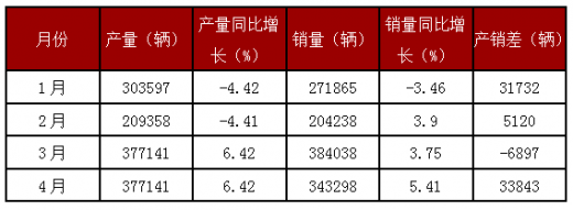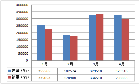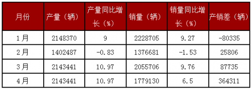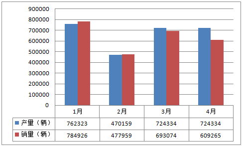 数据显示: 2016年4月中国汽车产量2520582辆,同比增长10.26%。其中产量为2143441辆,占比85.04%%;商用车产量为377141辆,占比14.96%。2016年4月中国汽车销量2122428辆,同比增长6.32%。其中乘用车销量为1779130辆,占比83.83%;销量为343298辆,占比16.17%。