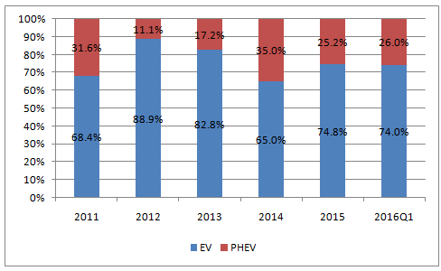 16一季度纯电动乘用车表现最为突出,新能源乘用车销售结构高端化。16 一季度国内新能源乘用车销量达3.95万台,同比增长107%。其中纯电动车销售2.47万台,增长125%,一季度表现最佳;插电混动销售1.48万台增长82%。而就纯电动乘用车的销售级别来看,依旧延续了1、2月的趋势,a0级和a级车的销售占比显著提升,它们一季度累计销量占比分别为41%和26%,而2015年,它们的销售占比仅为24%和10%。而a00级车第一季度的销售占比则由63%下滑到21%。虽然该变化在一定程度上是受很多微型车的销售时间推迟的影响,但它也反应了国内纯电动汽车市场正在进行着消费升级,消费者有意愿和能力购买价格相对较高的具有更好品质的产品,厂家也有动力向附加值更高的中高端产品拓展,这样的转变将会使得新能源汽车行业的发展更为健康和有持续性。