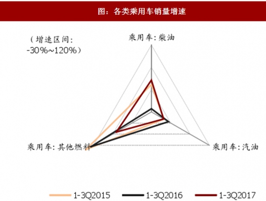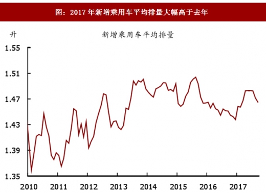 2)排量上,新增乘用车平均排量显著提高。2017年,新增乘用车销量排量呈现出两头收窄的局面:排量低于1.6升的乘用车销量同比下滑2.1%,排量高于3.0升的乘用车销量同比下滑17.3%。另一方面,排量在1.6升至3.0升之间的乘用车销量增速达到10%。整体上,2017年前3季度新增乘用车平均排量较去年同期增加了1.4%。