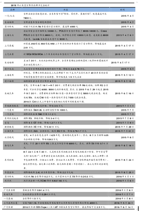 在市场竞争日趋激烈的影响下,2015 年二季度以来,以上海大众、上海通用、长安福特、北京现代、一汽-大众、长城、江淮为代表的主流合资与自主品牌纷纷先后宣布官方降价。