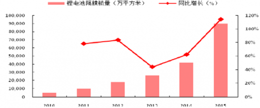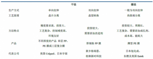 锂离子电池的四大关键材料为正极材料、负极材料、电解液以及隔膜。隔膜的主要功能是隔离正负极并阻止电子穿过,同时能允许离子通过,从而完成在充放电过程中锂离子在正负极之间的快速传输。隔膜性能的优劣直接影响着电池内阻、放电容量、循环使用寿命以及电池安全性能的好坏。隔膜越薄、孔隙率越高,电池的内阻越小,高倍率放电性能就越好。目前隔膜生产工艺主要分为干法和湿法两种,其中干法又分为单向拉伸工艺和双向拉伸工艺。干法单向拉伸工艺是在低温下将薄膜进行拉伸形成微缺陷,然后在高温下使缺陷拉开,形成微孔。由于是单向拉伸,其微孔结构呈扁长型,横向强度比较差,但优点是横向几乎没有热收缩。干法双向拉伸工艺是在聚丙烯中加入具有成核作用的β晶型改进剂造成不同相态间的密度差异,在拉伸过程中发生晶型转变成微孔。湿法又称热致相分离法,采用在聚烯烃树脂中加入成孔剂(如液态烃或一些小分子物质),加热熔融混合后,压制成膜片,再在高温下拉伸,最后用萃取剂洗脱残留成孔物质,烘干后即可制备出相互贯通的微孔膜材料。