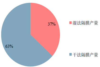 根据高工锂电最新的数据来看(2016年1季度),全球锂电池隔膜产量41,600万平米,其中;干法膜产量26,500 万平米,占比36%;湿法膜产量15,100万平米,占比64%,湿法膜占比大于干法膜。而我国占比格局正好相反,锂电池隔膜产量18,520 万平米,其中:干法膜产量11,720 万平米,占比63%;湿法膜产量6,800 万平米,占比37%,干法膜占比大于湿法膜。