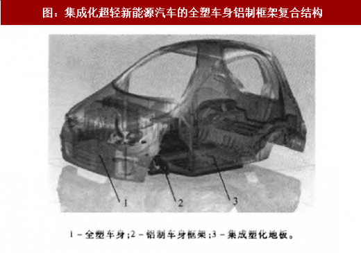 内饰重量的减轻可以通过多运用改性塑料来达到,车身和底盘重量的减轻除了上面所说的利用高强度钢、铝镁合金外,有研究者甚至提出了全塑车身的概念,提出了集成化超轻新能源汽车的概念,超轻新能源汽车主要由驱动电池单元、行驶系统、转向系统、铝制车身框架、复合材料车身、塑化地板等组成,车身整备质量能降低到 850 kg(包括电池),其全塑车身设计是新能源汽车轻量化设计的重要组成部分,与传统的汽车车身设计相比,全塑车身的设计是一个一体化、模块化、整体式的设计思路,同时实现功能与零部件的高度集成,从而减少零部件的数量,降低生产成本