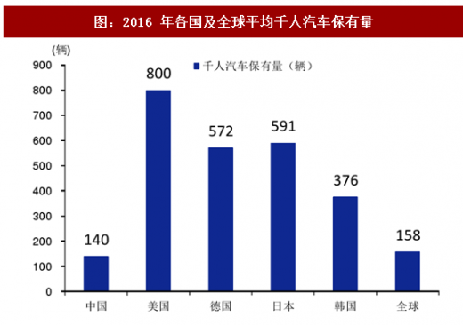 汽车总保有量突破 2 亿辆,增长空间依然充足。中国汽车年销量已连续 8 年居世界第一,在总保有量方面,根据公安部交管局的统计数据,截止 2017 年 3 月,我国汽车保有量首次超2亿台。根据中国国际贸易促进委员会的预测,我国在汽车总保有量上将于 2019-2020 年超越美国,成为世界汽车保有量最大的国家,增量空间仍然十分充足。据中国产业信息网测算,如果按照人均汽车保有量算,根据日本和韩国历史数据,当人均 gdp 达到 1 万美元时,千人汽车保有量应该达到 200 辆,2016 年我国人均 gdp 超 8000 美元,我国千人汽车保有量为 140 辆,根据中国产业信息网预测,到 2020 年我国人均 gdp 将达到 1 万美元,若按照千人保有量 200 辆算,到 2020 年我国汽车保有量预计达到 2.8 亿辆以上,市场空间缺口约达 8 千万辆。
