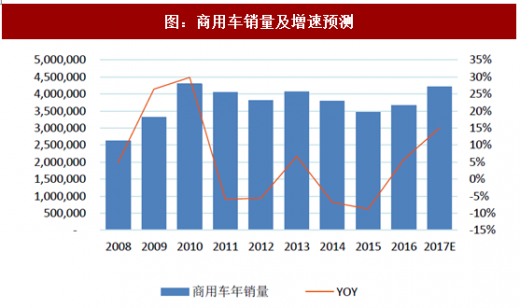 重卡行业的复苏仍在持续,投资形势好转,以物流车为主的替换性需求成为主要增长动力,加上去年颁布的国标1589,对道路运输车辆重卡、中卡、轻卡的车辆道路载荷做了限制规定。如果新的标准严格执行,会进一步增加用户换车数量,叠加换车潮的影响,截止至2017年10月,商用车整体销量同比增加17.48%,预计全年商用车市场整体增长15%,其中重卡增速预计超过50%。预计2018年增速8%仍处于高位。