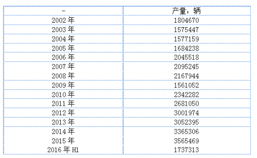 2002年墨西哥汽车产量1804670辆,2015年墨西哥汽车产量3565469辆,2016年h1墨西哥汽车产量1737313辆。