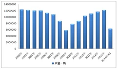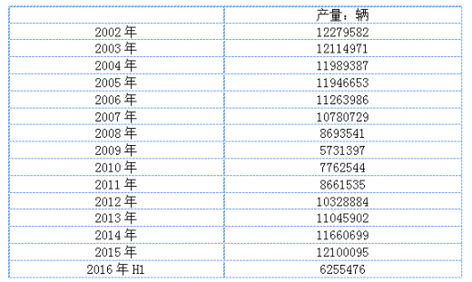 2002年美国汽车产量12279582辆,2015年美国汽车产量12100095辆,2016年h1美国汽车产量6255476辆。