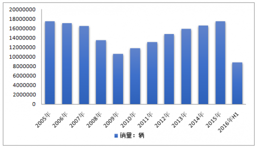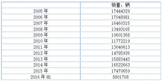2005年美国汽车销量17444329辆,2015年美国汽车销量17470659辆,2016年h1美国汽车销量8801708辆。