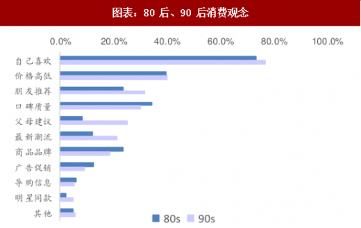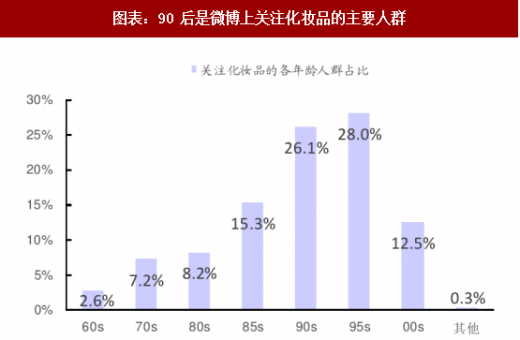 与 70 后不同,80 后生活的时代开始变得富裕,到 90 后由于出生在物质充裕的年代,自主意识与消费意愿更强,在消费时更加注重自己喜欢与否。90 后一代的成长几乎伴随着互联网的诞生和高速发展,2017 年我国网民中三成为 90 后,80、90 后占比为 53.5%。不同于 70、80 后主要在线下购物消费,90 后更偏好网上购物。由于线上购物的便捷性,当前 80 后也逐渐成为线上化妆品消费的一大主力群体。80、90 后相关消费资讯的获得也更多在线上,就化妆品领域,据微博数据中心发布的 2017 年化妆品报告,其用户中关注化妆品占比最大的人群为 90 后,占比达 50% 以上,80、90 后合计占比为 77.6%。