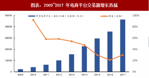 当前我国主力消费群体的线上消费习惯与电商渠道的蓬勃发展互相塑造和成就。正如上文所说,90 后的成长伴随着互联网的高速发展,在这一群体进入消费成长期时,电商渠道也开始了蓬勃发展。2009 年到 2017 年淘宝销售额年均复合增速为 47.37%,正是 85、90 后走入社会,独立生活的时期。同时,渠道的快速发展,相应物流配送、电商平台对商家的规范化的推进、信用机制逐步完善,线上购物更加便利,更多消费群体也开始“触网”购物。2017 年阿里平台交易额达 4.6 万亿,同比增长 29.87%。