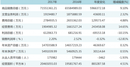 2017年中国百货店销售总额7155.14亿元,比2016年的6558.50亿元增长了9.10%;利润总额为61.21亿元,比2016年的68.12亿元下降10.15%;主营业务利润为191.95亿元,比2016年的187.59亿元增长2.32%。年末资产总额达到1470.36亿元,同比增长0.32%。2017年会员企业经营面积有所增加,为2047万平方米,同比增长4.51%。从业人员平均数为17.60万人,比2016的17.94万人减少了1.93%。