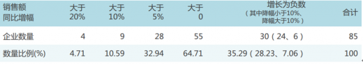 2017年销售额同比增幅超过20%的企业有4家;增速大于10%的企业达9家;2017年有64.71%的企业销售额同比增长;销售额同比减少的企业达到了35.29%,其中降幅超过10%的企业有6家。
