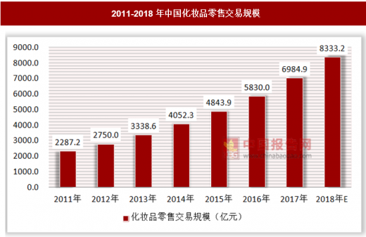 从整体零售口径统计来看, 2016 年中国化妆品零售整体交易规模达到了5830亿元,增长率达到20.4%,预计到2018年,这一规模将超过 8000 亿元。