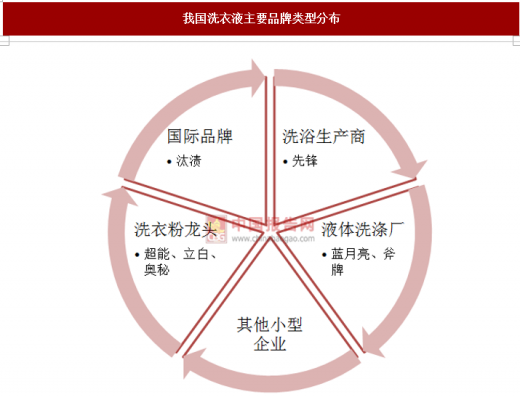 从品牌分布来看,可大致分为五类阵营。第一类阵营是以汰渍为代表的国际品牌;第二类阵营是原市场龙头,如超能、立白、奥秘等;第三类阵营是液体洗涤生产商,如蓝月亮、斧牌;第四类阵营是以先锋为代表的洗发水沐浴露生产商;第五类阵营是其他小型企业。