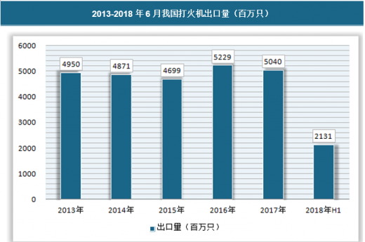 2017年我国打火机出口量为50.4亿只,比上一年度有所下滑。近几年我国打火机出口量基本围绕着每年50亿只左右波动。2018年上半年出口量为21.3亿只。