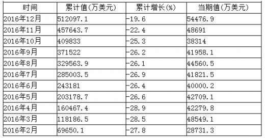 2016年1-6月中国棉纱线出口数量为169,918吨,同比下降8.8%;2016年1-6月中国棉纱线出口金额为781,357千美元,同比下降14.8%。2016年1-6月中国棉纱线出口量统计表如下表所示: