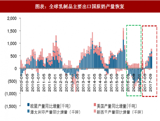 单产提升是原奶供给恢复的主要驱动因素。2017 年初泌乳奶牛存栏量减少,所以预计单产提升是原奶供给恢复的主要驱动因素。2017 年 3 月至 10 月,新西兰原奶产量分别同比变动 9.2%、6.3%、-0.7%、21.1%、11.7%、-1.6%、-1.6%、2.7%,欧盟原奶产量分别同比变动-0.5%、0.3%、-0.2%、0.7%、0.9%、2.3%、4.1%、4.1%。欧盟、新西兰单产恢复我们认为主要是奶农开始实现盈利,澳大利亚单产恢复,我们认为主要是去年影响单产量的天气因素消除。