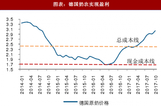 欧盟和新西兰奶农开始实现盈利,提升奶农积极性。欧盟 2015 年 3 月取消牛奶配额制,原奶产量大幅增加,奶农亏损严重,自 2017 年 4 月奶农实现盈利,产量开始恢复。新西兰奶农自 2014 年底原奶价格低于现金成本线,奶农已经连续亏损两年,2017 年 4 月开始奶农开始实现盈利。