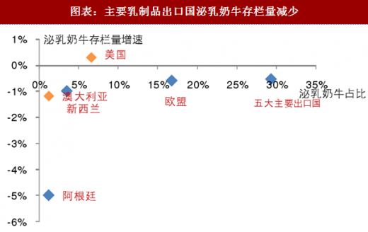 乳制品主要出口国供给端结束下滑趋势,自 2017 年 3 月开始实现正增长。主要出口国新西兰、欧盟、美国、澳大利亚,原奶产量同比增速自 2016 年 6 月开始下滑,6-12 月分别同比下滑 0.7%、0.4%、0.9%、1.1%、2.5%、2.1%、1.6%,供给收缩是 2016 年 6 月至 12 月国际大包粉价格上涨的主要原因。但是自 2017 年 3 月开始主要出口国原奶产量开始恢复增长,2017 年 3-10 月原奶产量分别同比变动 0.8%、1.1%、-1%、1.2%、1.4%、2.0%、2.4%、3.2%,国际主要乳制品出口国供给开始恢复,是全球原奶价格上涨乏力的主要原因。
