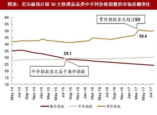 2017 年初首次超过 50%,而平价指数也于 2015 年底首次超过了廉价指数,显示消费升级趋势明显。