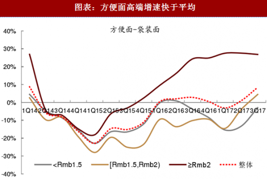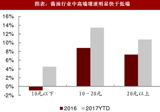 在方便面、调味品等其他基础食品饮料品类上,我们也看到了明显地高端化加速迹象。 2h16 起方便面品类中的袋装面和碗装面都呈现高端增速快于低端的趋势,而酱油行业中均价 10 元以上的高端产品增速显著快于 10 元以下的中低端产品。