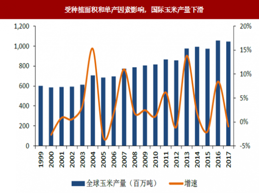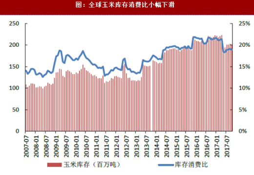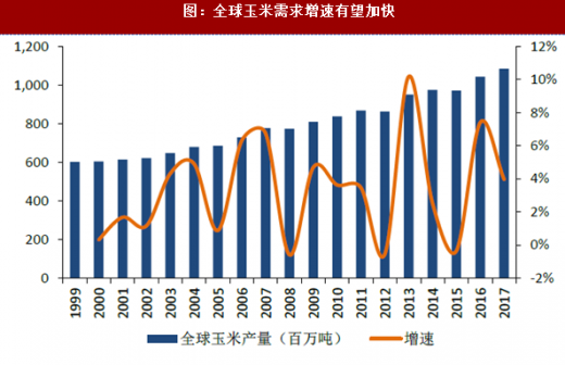 国际玉米产量减少,需求提速增长。国际玉米产量从种植面积和单产两方面下滑导致玉米产量下滑。受大豆玉米比价高于2.2的影响,usda预测2017/18销售年度全球玉米种植面积下滑92万公顷,其中产量占比超过35%的美国在2017/18销售年度的玉米种植面积下滑132万公顷,同比大幅下滑3.76%。玉米单产方面,受去年厄尔尼诺天气的影响逐步逝去,降水相较厄尔尼诺时期有所减少,美国玉米单产也出现了2.74%的小幅下滑,因此国际玉米产量同比出现了3.6%的下滑,达到10.44亿吨。