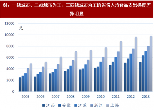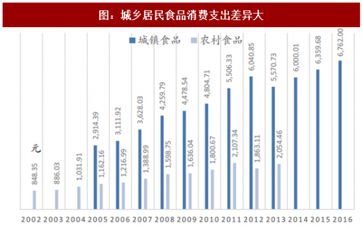 从数据上看,城镇居民人均消费性支出是农村居民人均消费性支出的3倍左右;以食品为例,城镇居民人均食品消费支出是农村居民人均食品支出的2.7倍左右。从中我们可以看出,城乡差异巨大。
