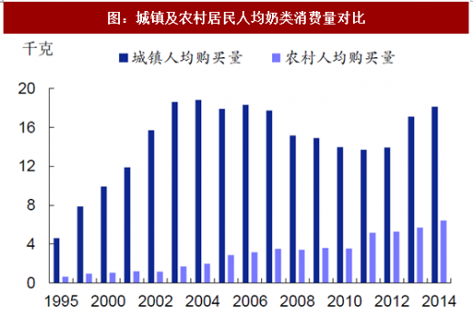 一二线消费增长是行业上一轮增长重要动力。通过对城乡居民收入增速与龙头乳企收入增速数据进行拟合,过去几年行业增速与城镇居民收入提升更为相关。据中国奶业年鉴数据,城镇居民的人均乳制品消费量在2014年已接近20kg,并不明显逊于日本,其后在城镇居民收入增速放缓及消费基数达到较高水平后,消费增速开始明显放缓。同时低线市场消费能力尚不足以接力,导致行业整体下游需求疲软,增长几乎陷入停滞状态。但目前城镇居民与农村居民的人均乳制品消费仍然差距明显,而城镇居民与发达国家人均消费水平差异并不大,说明限制消费的主要因素仍是发展而非生活习惯,未来农村居民的消费水平若能不断向城镇居民靠拢,行业整体消费量提升空间仍十分可观。