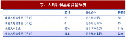 2020年行业规模有望突破5000亿。截止到2016年,据国家统计局数据,城镇与农村居民人口之比约为57:43,而人均乳制品消费量约16千克。结合中国奶业年鉴数据,城镇与农村居民人均消费量之差接近3倍,大致推算城镇居民人均消费量约23千克,农村居民人均消费量约8千克。据此,我们对2020年行业空间进行简单测算,预计城镇居民消费量未来4年仍能保持6%左右的复合增速;农村市场基数仍低,预计在收入水平提升及消费升级共同作用下可保持12%左右的复合增速;同时假设农村人口占比以每年0.5pct的速度下降,预计到2020年农村人口占比将下降至41%左右。届时人均乳制品消费量将在23千克左右,较2016年提升超过35%。暂不考虑结构升级及单价提升等因素,2020年中国乳制品市场规模有望达到5000亿,较2016年增加近40%,消费量也将超过4000万吨。