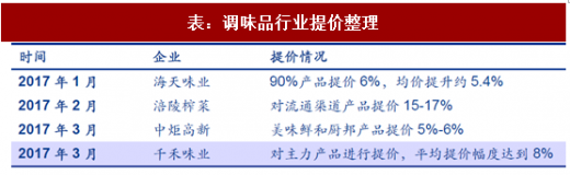 去年下半年以来,受环保政策趋严、部分不合规工厂停工的影响,调味品的主要包装材料如纸箱、玻璃等价格均出现大幅上涨,同时随国家加强对超载的检查力度,公路运输价格也有所上涨。受此影响,主流调味品企业陆续在今年上半年进行了提价,以覆盖成本上涨压力,保证毛利率相对平稳。由于本轮提价为行业性行为,并且公司会针对提价加大费用投放力度以帮助其快速完成过渡,因此提价对产品销量影响有限,反而在提价消化过程中,重点公司对渠道利润进行了合理再分配,激发渠道积极性,助力收入在提价消化完毕后实现加速增长。
