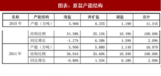 近年来,受下游盐化工行业的景气程度影响,我国制盐工业的扩能步伐正在逐步减弱。截至2015年底,全国原盐产能11,345万吨,较2014年增加375万吨,同比增速略有回升;“十二五”期间,我国原盐产能呈增长,但近两年产能增速呈放缓趋势。