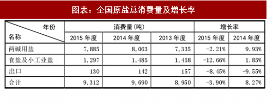 2014年和2015年全国原盐总消费量分别为9,690万吨和9,312万吨,其中2015 年全年国内两碱用盐消费量占全国盐总消费量的84.68%。由于下游两碱行业走势低迷,两碱用盐消费量有所下降。其中,2015年两碱用盐较2014年同比减少2.21%。