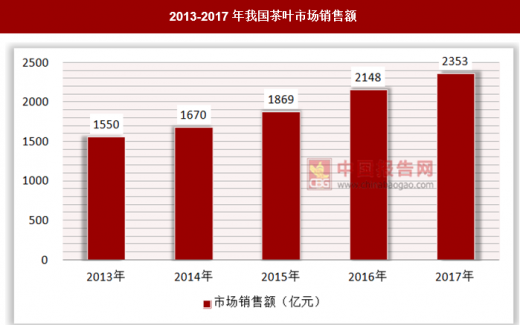 近年来国内茶叶销售额业在不断提升,高档茶价格平稳、销量略减,中低档茶的价格差距继续缩小,价格略升、销量稳增。2017年茶叶总销售额约为2353亿元,同比增长了9.54%。