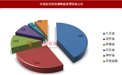 植物油是中国居民的生活必需品之一。食用植物油按照品类来分,主要有大豆油、菜籽油、花生油、棕榈油、芝麻油、橄榄油、葵花籽油、棉籽油和玉米油,按照国人的消费来看,其中大豆油消费占比最高约为42%。
