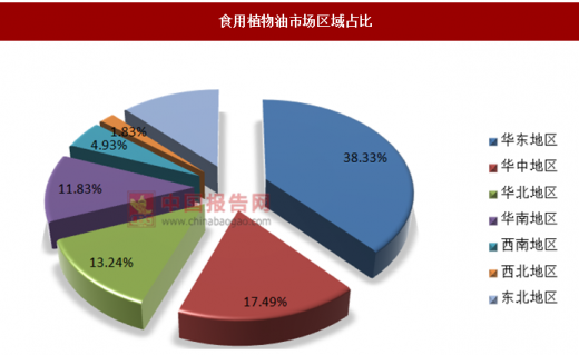 从食用油区域市场来看,华东地区食用油市场发展较为成熟,食用油市场规模在整个食用油市场中的比重高达38%以上;其次是华中地区、华北地区以及东北地区、华南地区,四者占比分别是17.49%、13.24%和12.35%、11.83%,总体差距不大;西南地区和西北地区的食用油市场较小,占比分别是4.93%和1.83%。总体来看,我国食用油市场地域分布不均衡,主要集中在经济比较发达的华东地区等。